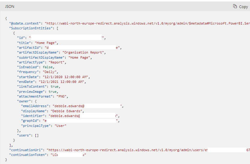 But this is where logic is not quite working (the hope is that this will resolve fairly quickly). The above API doesn’t give you information back if you subscribe via the app. Only when you subscribe to the actual Dashboard in the workspace.