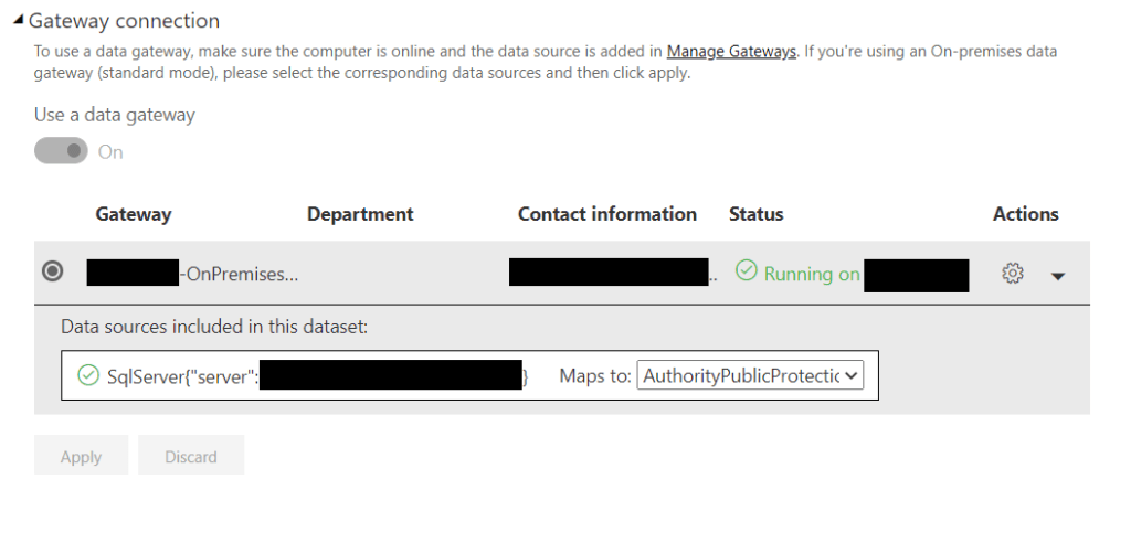 - Once installed it needs to be configured. In Power BI Service, Settings, Manage Gateways