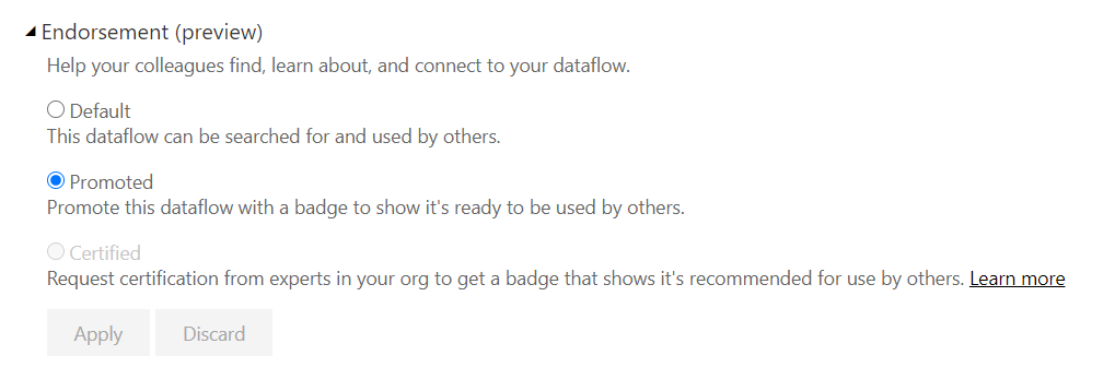 You can now as of June 2020, set your dataflow to promoted to ensure everyone knows that this a dataflow that has been created and managed centrally, possibly by your BI team. It will eventually give you your ‘one view of the truth’