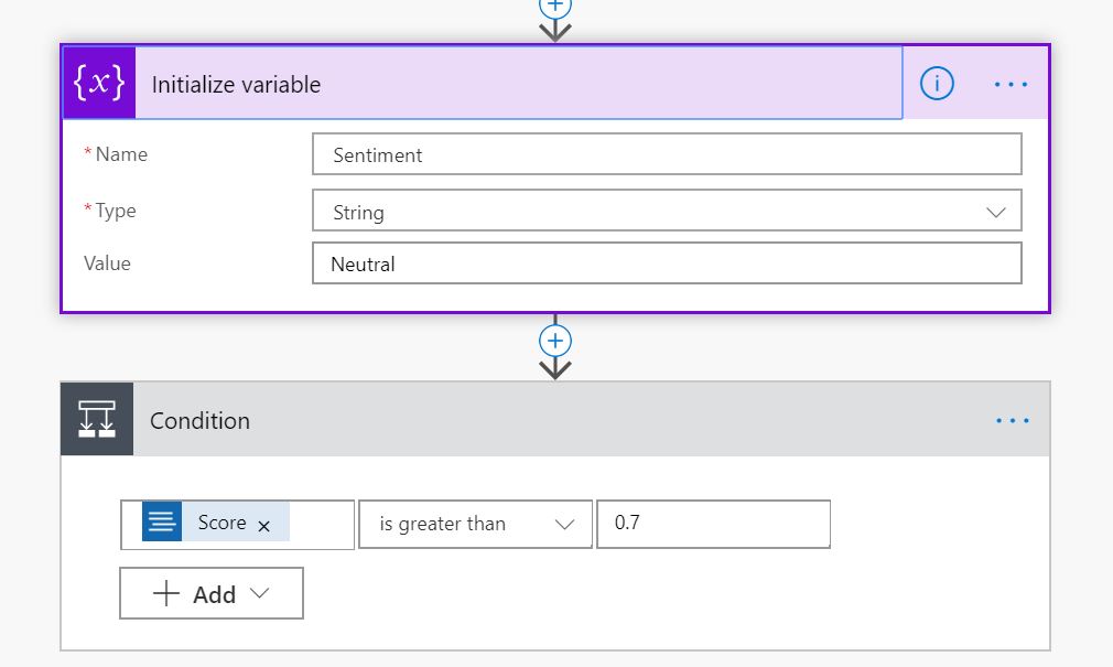 Create Sentiment which is Neutral. If Score is over 0.7 then Positive. If under 0.3 then negative
